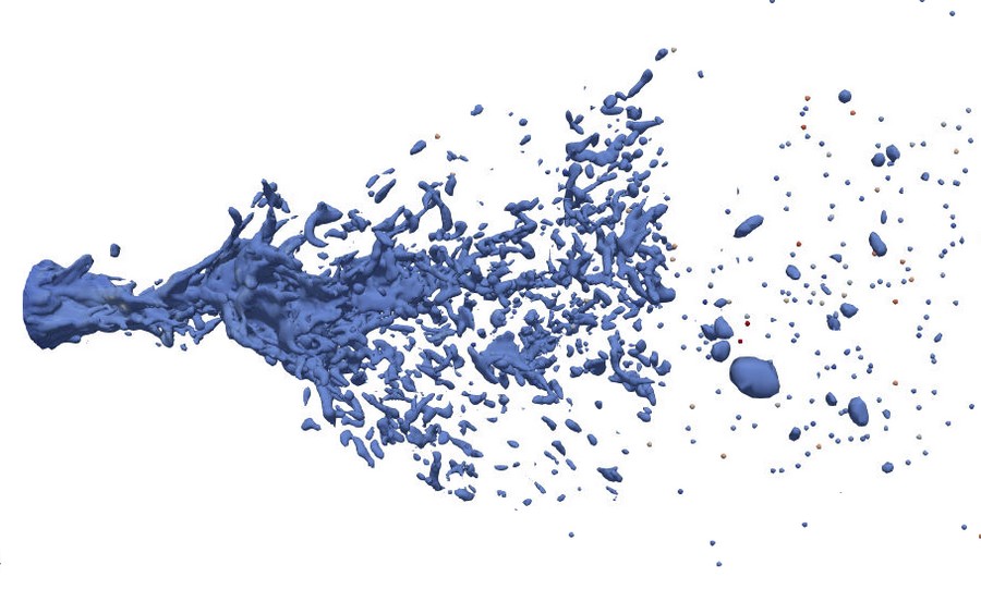Разработана математическая модель газокапельного потока с использованием смешанного эйлерово-лагранжева подхода, позволяющая моделировать одновременно как первичную атомизацию струй жидкости совместно с течениями окружающего газа в широком диапазоне чисел Маха, так и вторичный распад и перенос образовавшихся многочисленных капель жидкости.