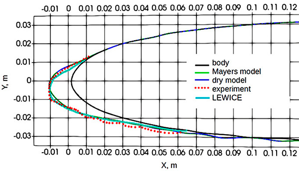 Получено удовлетворительное совпадение результатов с экспериментальными данными и с результатом, полученным в программном пакете LEWICE [https://doi.org/10.2514/6.2017-3416].